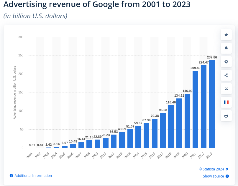 This was the spark. The fuel was ad revenue. Advertisers pay based on the reach of the platform they’re advertising on, and when Google became most people’s first-stop shop for the rest of the internet, its ad revenue became obscene.